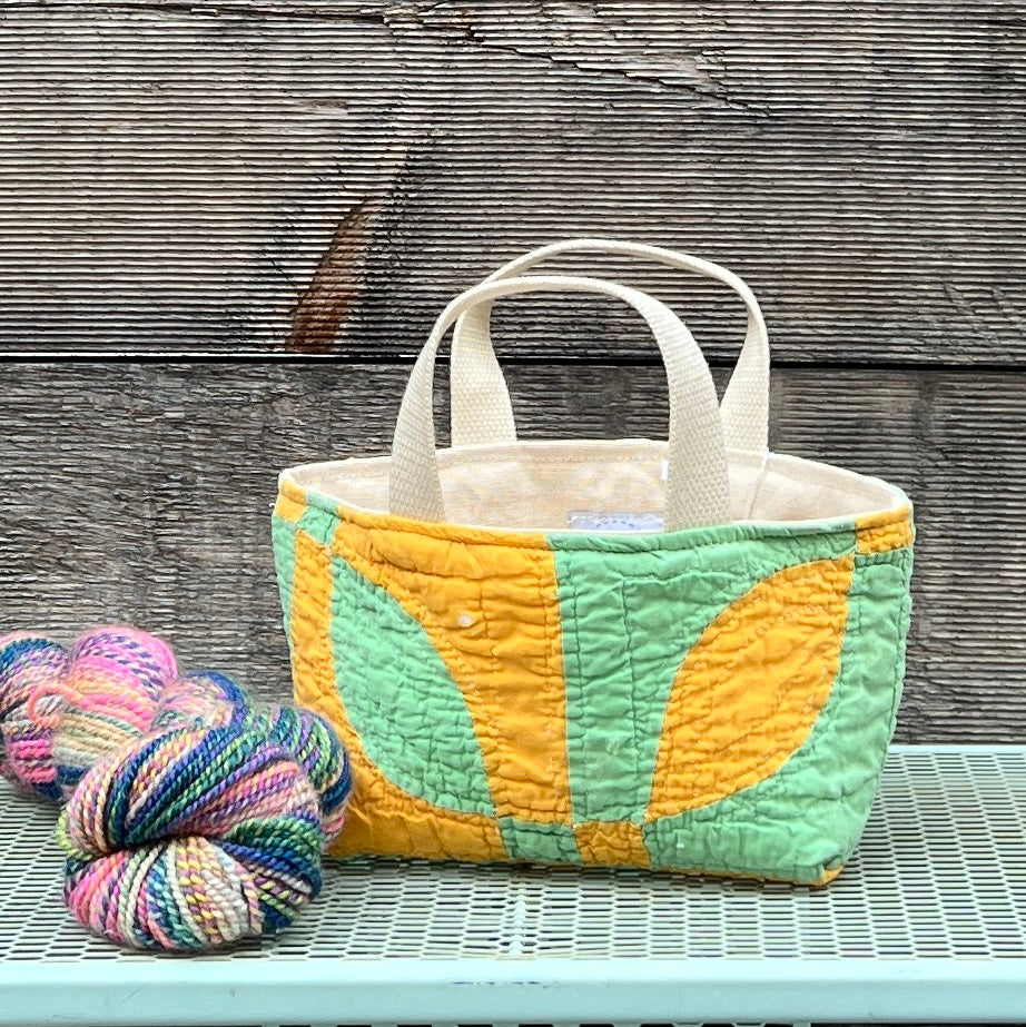 Made to hold supplies and works-in-progress. They're lined in heavy-weight canvas so they stay open at your side. Available in small, medium, and large. They also double as wonderful gift bags!